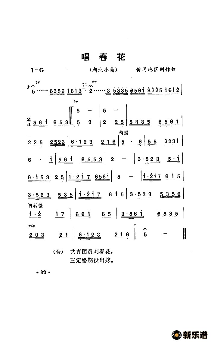 严锦芳何岭仙等演唱的唱春花(湖北小曲)歌词,唱春花(湖北小曲)简谱.