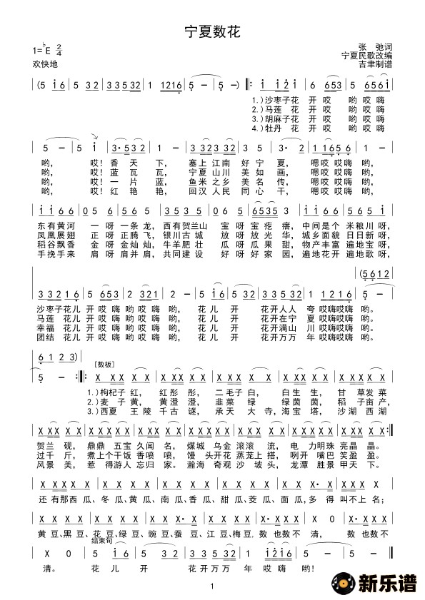 演唱的宁夏数花歌词,宁夏数花简谱.