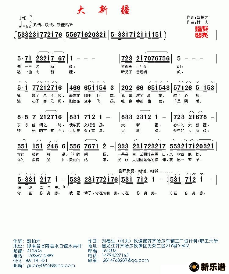 演唱的大新疆(郭柏才词 村夫曲)歌词,大新疆(郭柏才词 村夫曲)简谱.