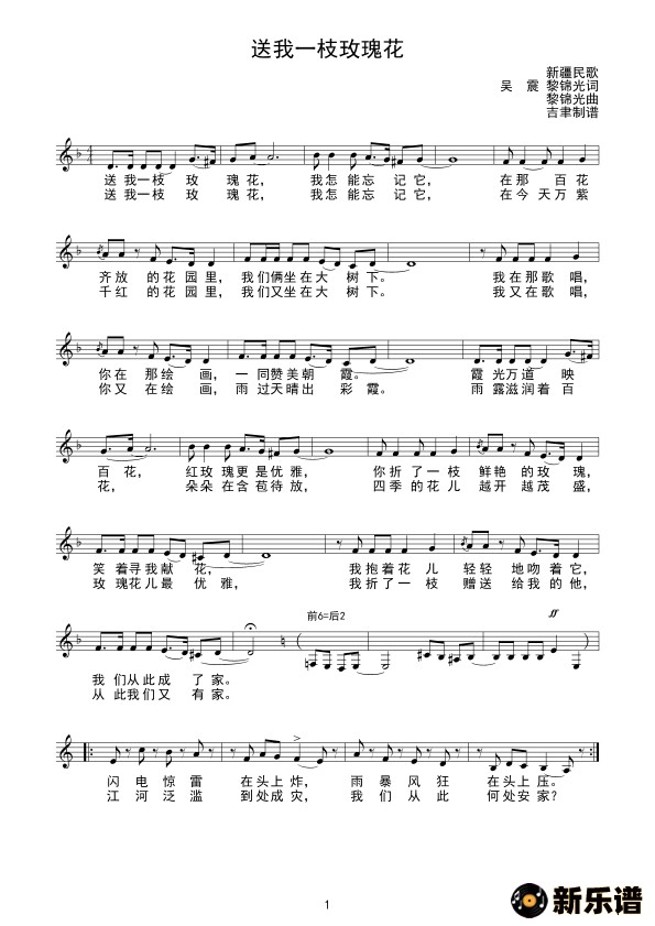 演唱的送我一枝玫瑰花(新疆民歌)线谱歌词,送我一枝玫瑰花(新疆民歌)线谱简谱.