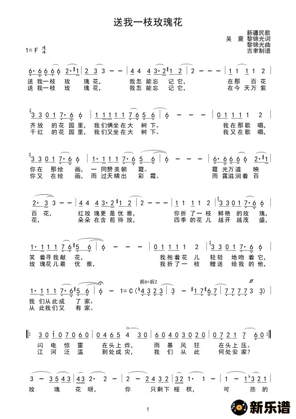 送我一枝玫瑰花(新疆民歌)/ 相关曲谱