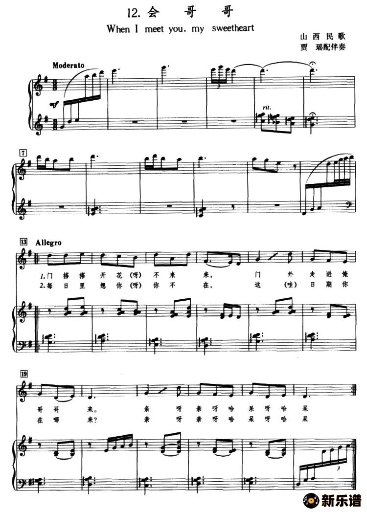 山西民歌、贾瑶配伴奏演唱的会哥哥(正谱)歌词,会哥哥(正谱)简谱.