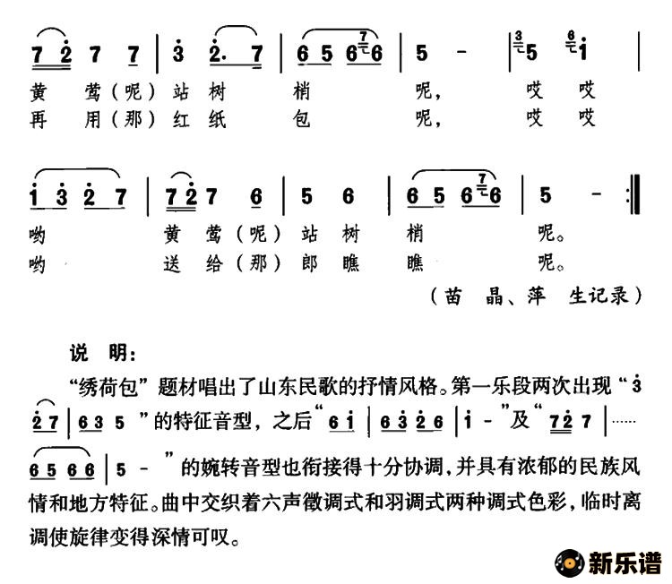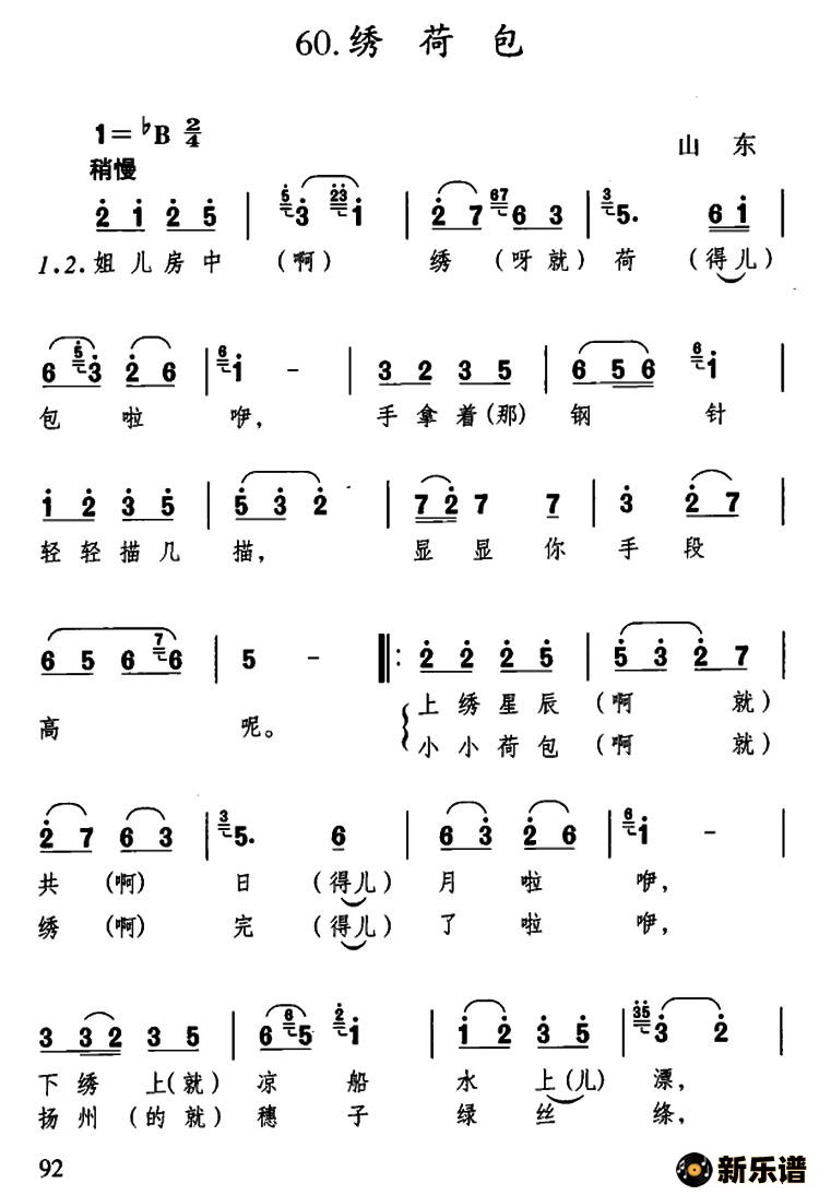 演唱的绣荷包(山东民歌)歌词,绣荷包(山东民歌)简谱.