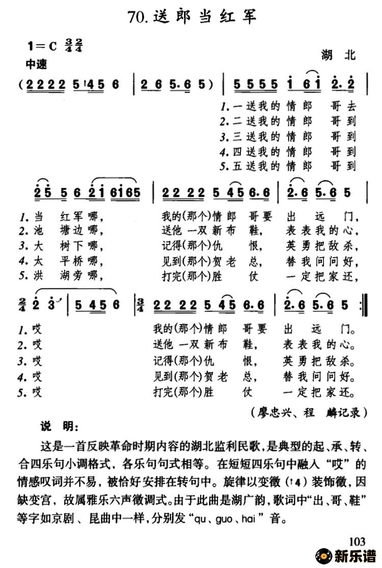 演唱的送郎当红军(湖北民歌)歌词,送郎当红军(湖北民歌)简谱.