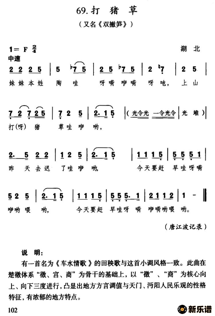 演唱的打猪草(湖北民歌)歌词,打猪草(湖北民歌)简谱.