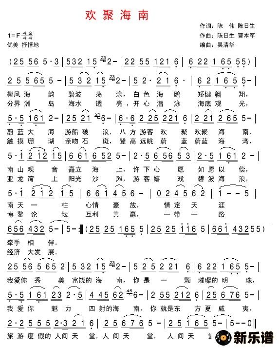 心曲悠悠(李艺明)演唱的欢聚海南歌词,欢聚海南简谱.