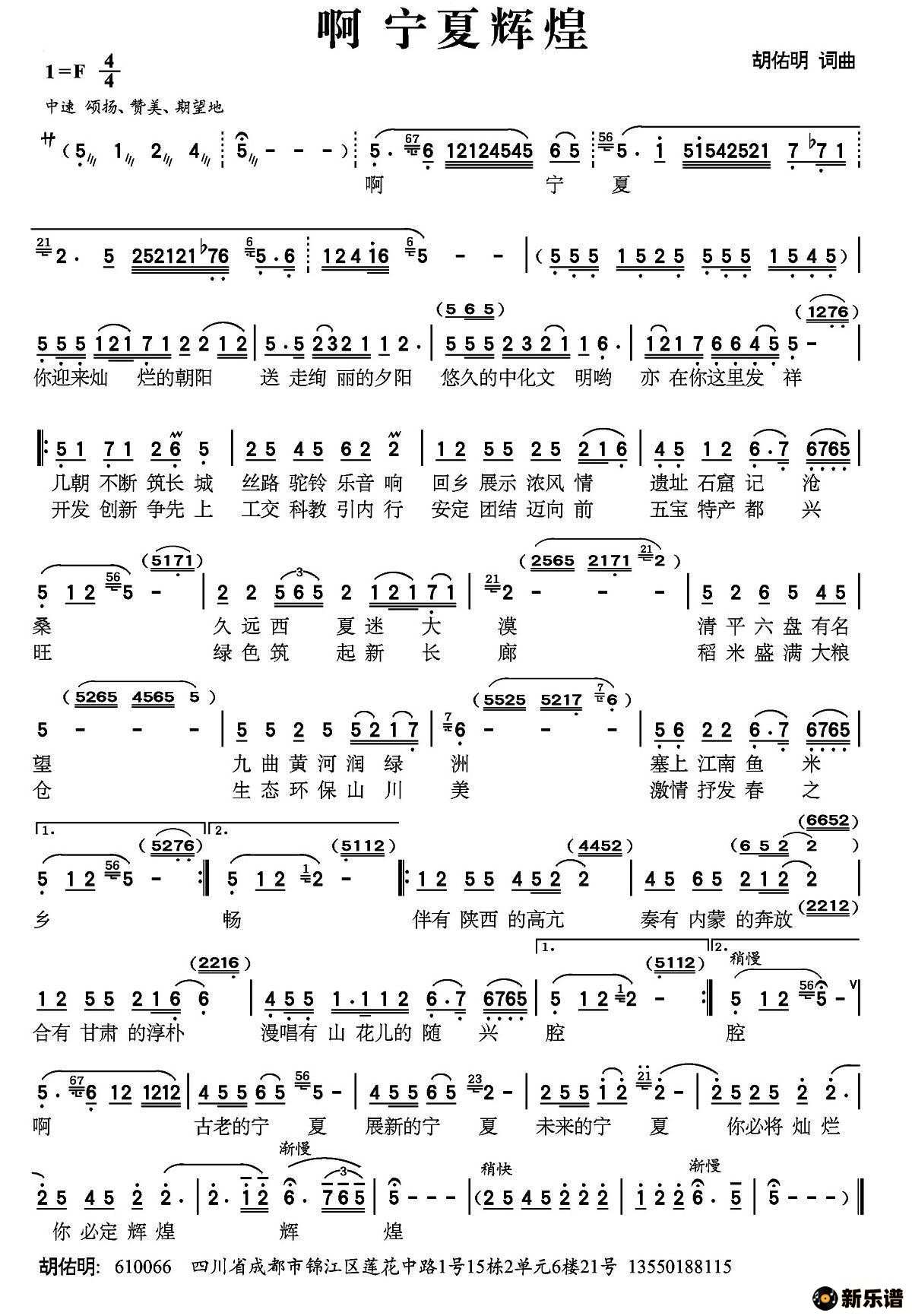 啊 宁夏辉煌/胡佑明 相关曲谱