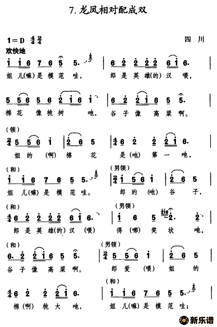 演唱的龙凤相对配成双(四川民歌)歌词,龙凤相对配成双(四川民歌)简谱.