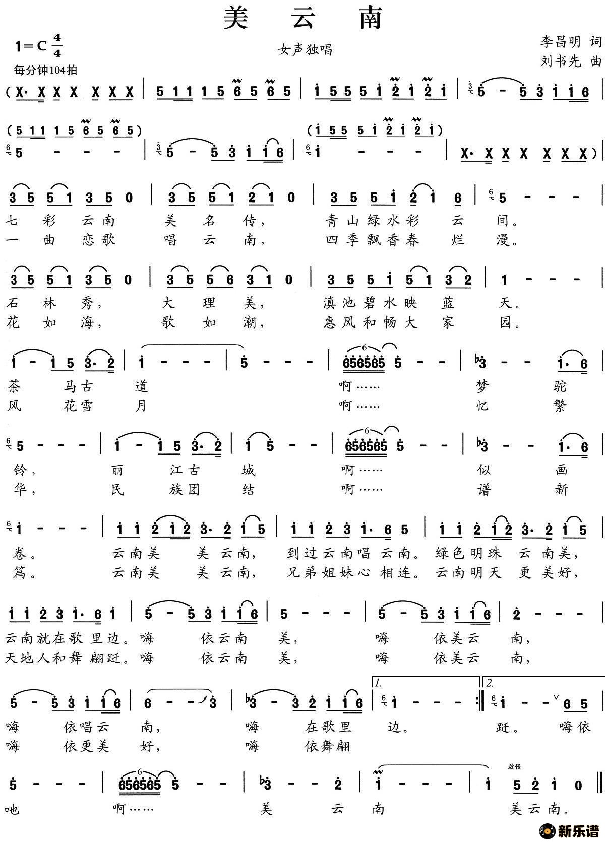 演唱的美云南(李昌明词 刘书先曲)歌词,美云南(李昌明词 刘书先曲)简谱.