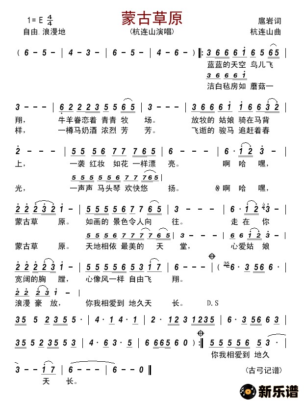 杭连山演唱的蒙古草原歌词,蒙古草原简谱.