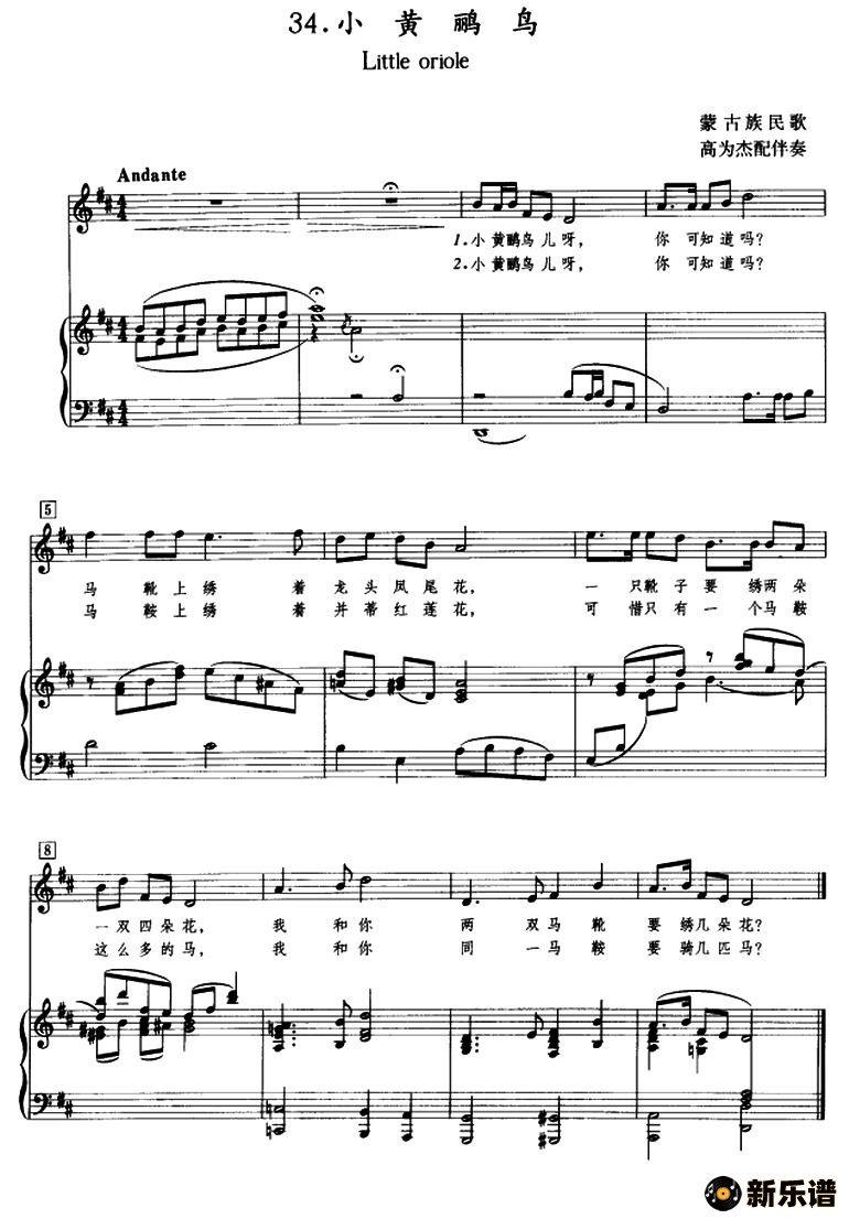 小黄鹂鸟(正谱、高为杰配伴奏版)/蒙古族民歌、高为杰配伴奏 相关曲谱