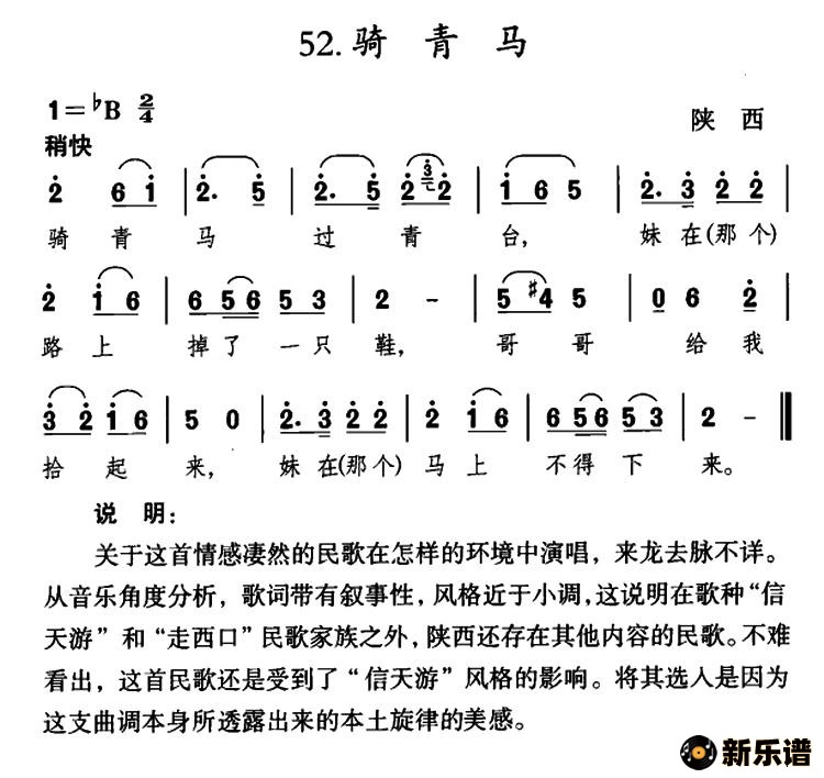 演唱的骑青马(陕西民歌)歌词,骑青马(陕西民歌)简谱.