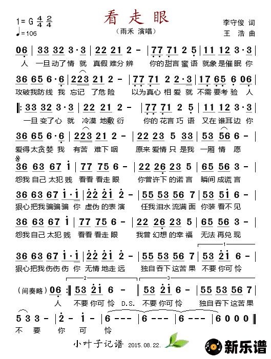 雨禾演唱的看走眼歌词,看走眼简谱.