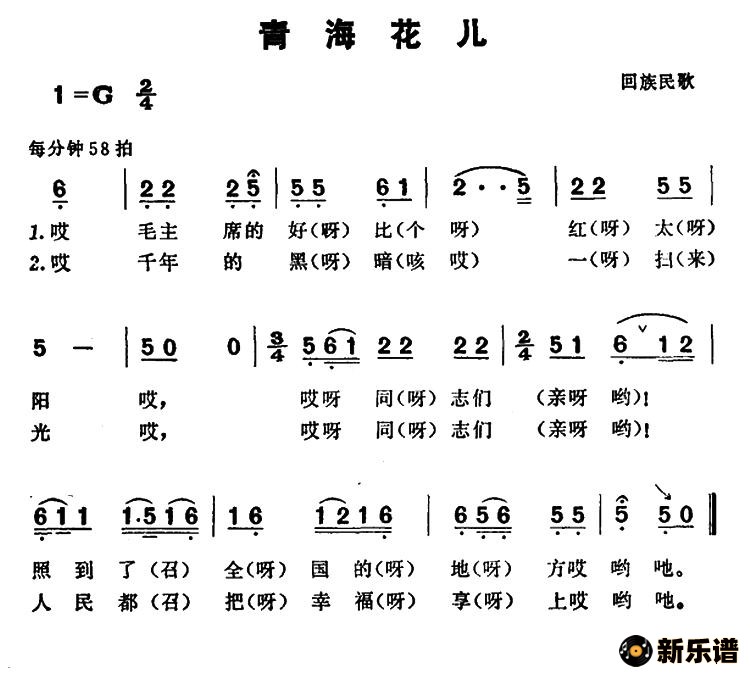演唱的青海花儿(回族民歌)歌词,青海花儿(回族民歌)简谱.