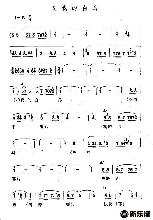 > 我的白马(新疆伊犁 维吾尔民歌 第十二套《小莱龙》)简谱