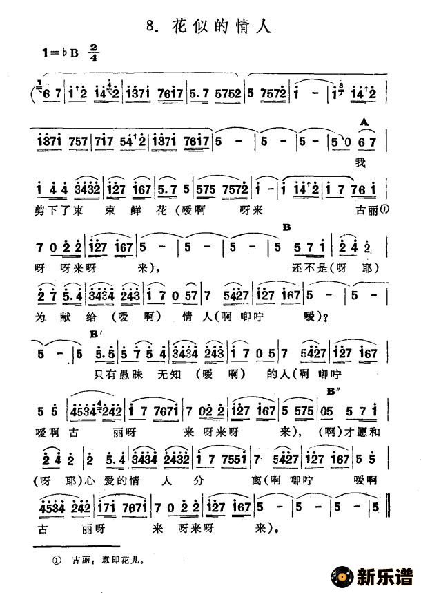 演唱的花似的情人(新疆伊犁 维吾尔民歌 第五套《小汗莱龙》)歌词,花似的情人(新疆伊犁 维吾尔民歌 第五套《小汗莱龙》)简谱.