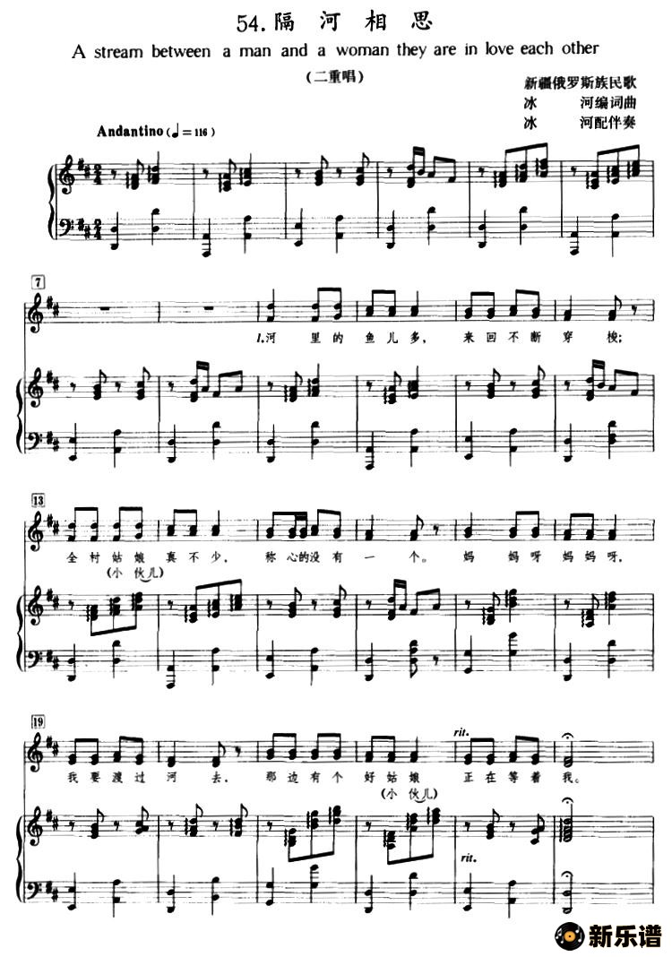 隔河相思(正谱)/新疆俄罗斯族民歌、冰河编词曲配伴奏 相关曲谱