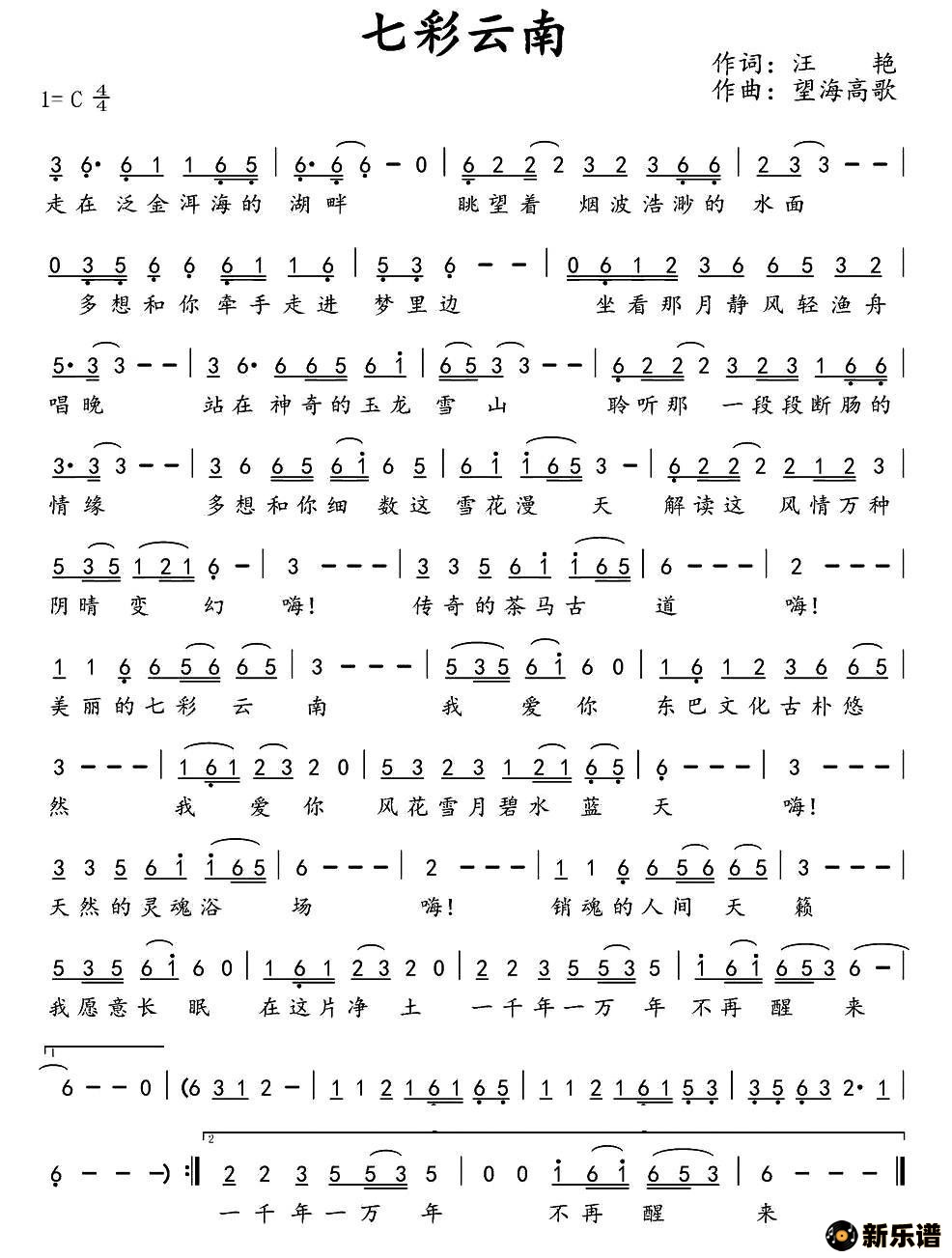 演唱的七彩云南(汪艳词 望海高歌曲)歌词,七彩云南(汪艳词 望海高歌曲)简谱.