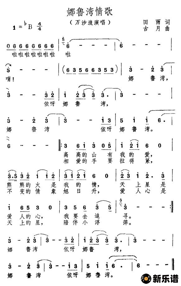万沙浪演唱的娜鲁湾情歌歌词,娜鲁湾情歌简谱.