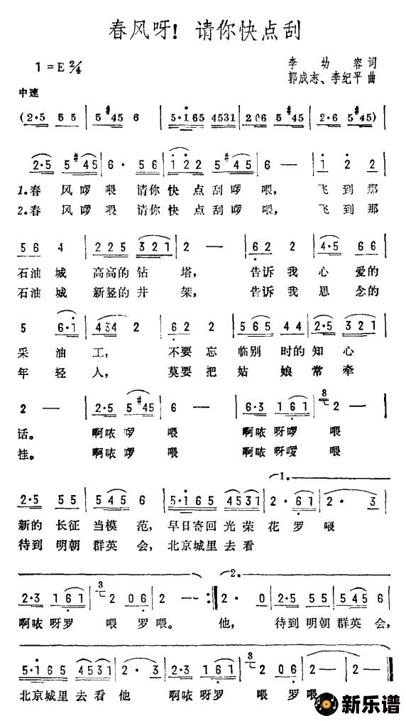 李谷一演唱的春风呀!请你快点刮歌词,春风呀!请你快点刮简谱.