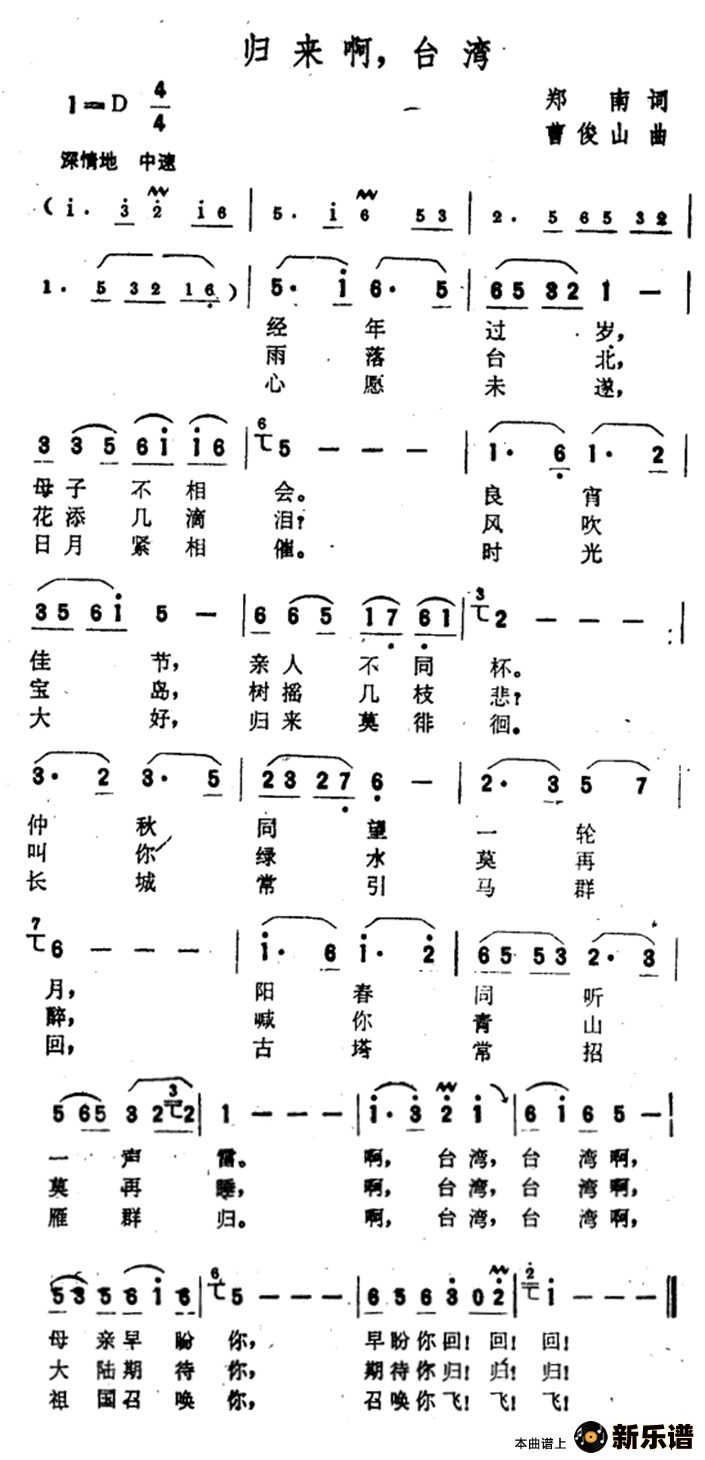 演唱的归来啊,台湾歌词,归来啊,台湾简谱.
