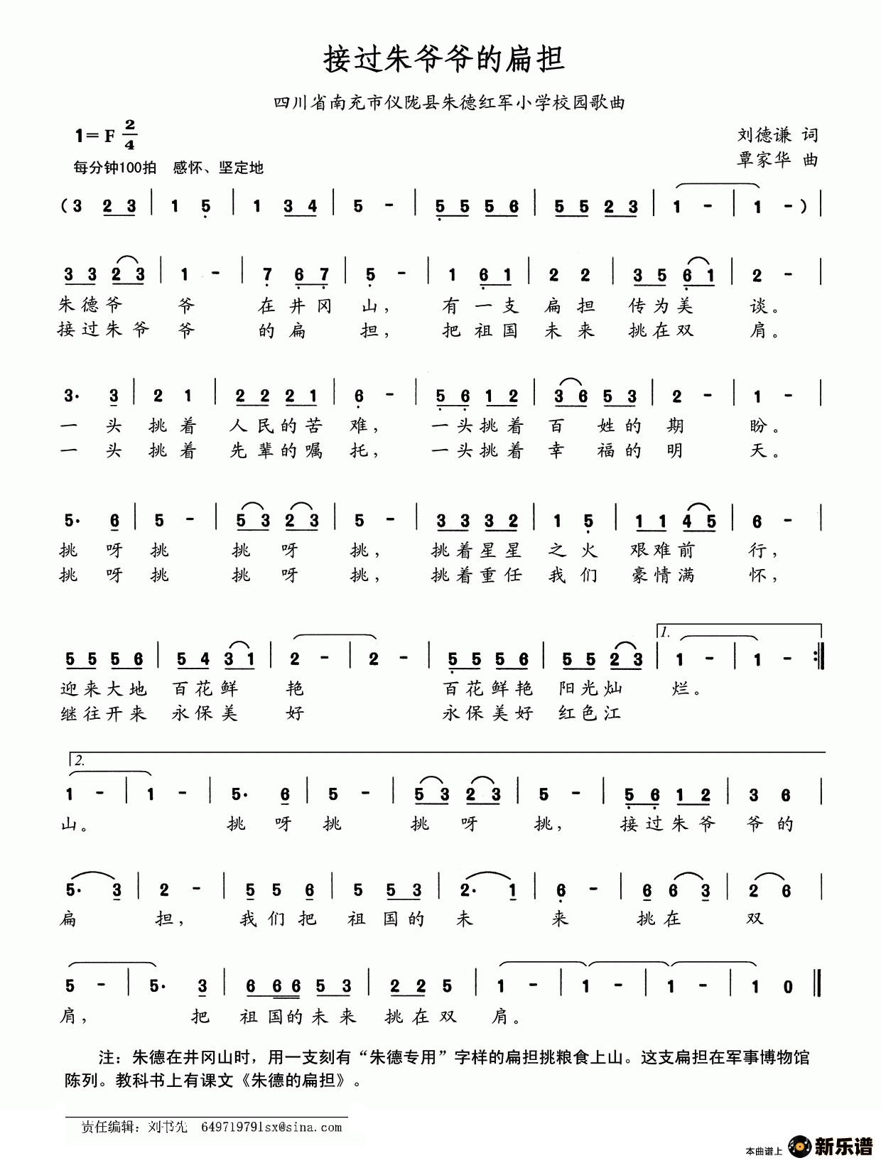 演唱的接过朱爷爷的扁担(四川省南充市仪陇县朱德红军小学校园歌曲)歌词,接过朱爷爷的扁担(四川省南充市仪陇县朱德红军小学校园歌曲)简谱.