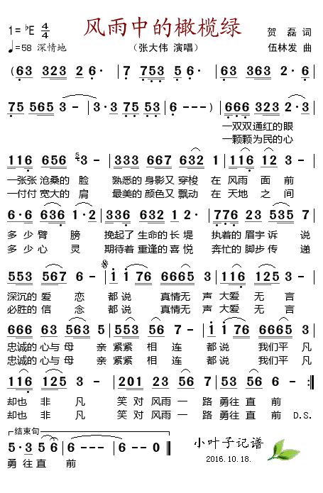 《风雨中的橄榄绿》简谱 张大伟-小叶子制谱