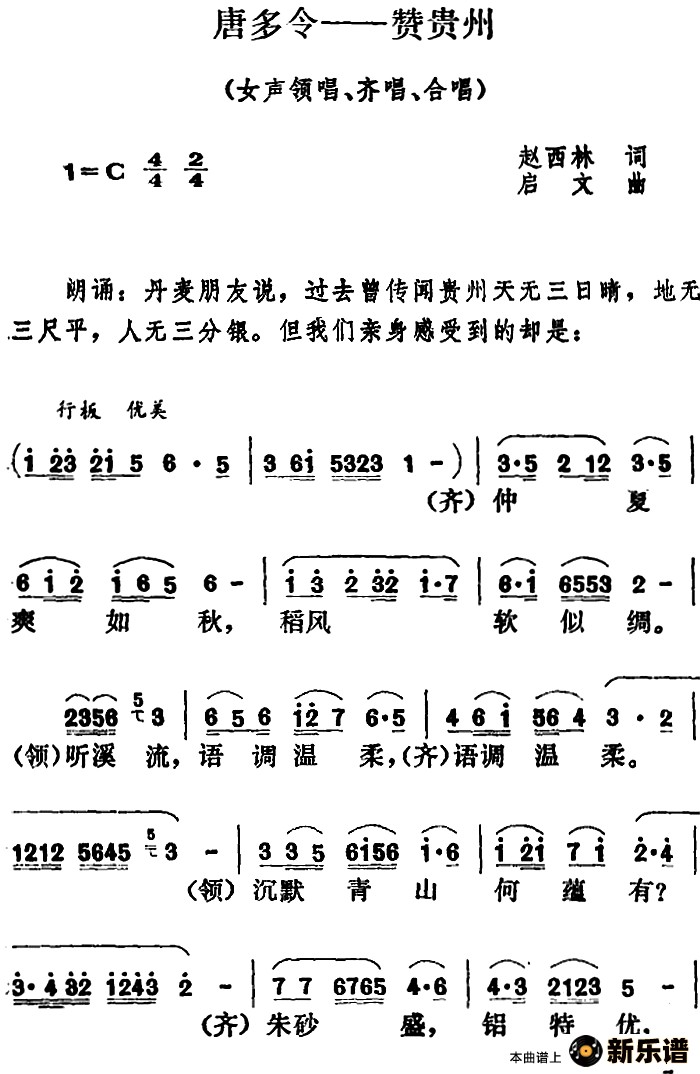 演唱的唐多令--赞贵州歌词,唐多令--赞贵州简谱.