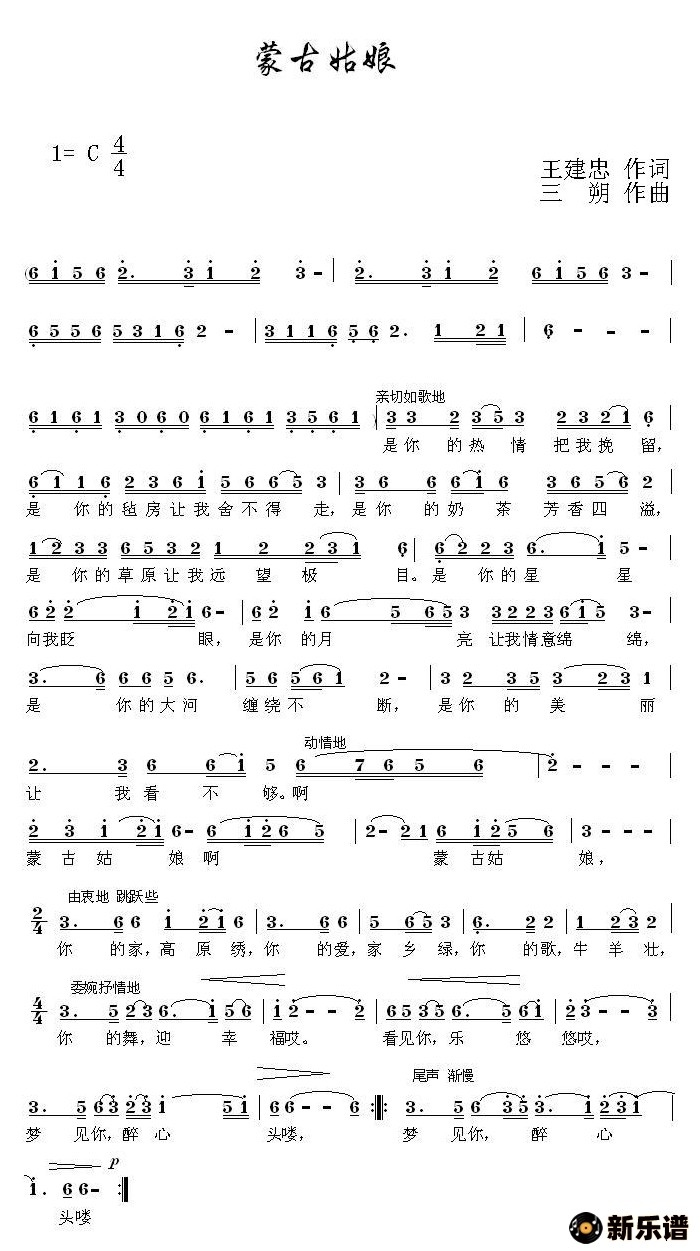 演唱的蒙古姑娘歌词,蒙古姑娘简谱.