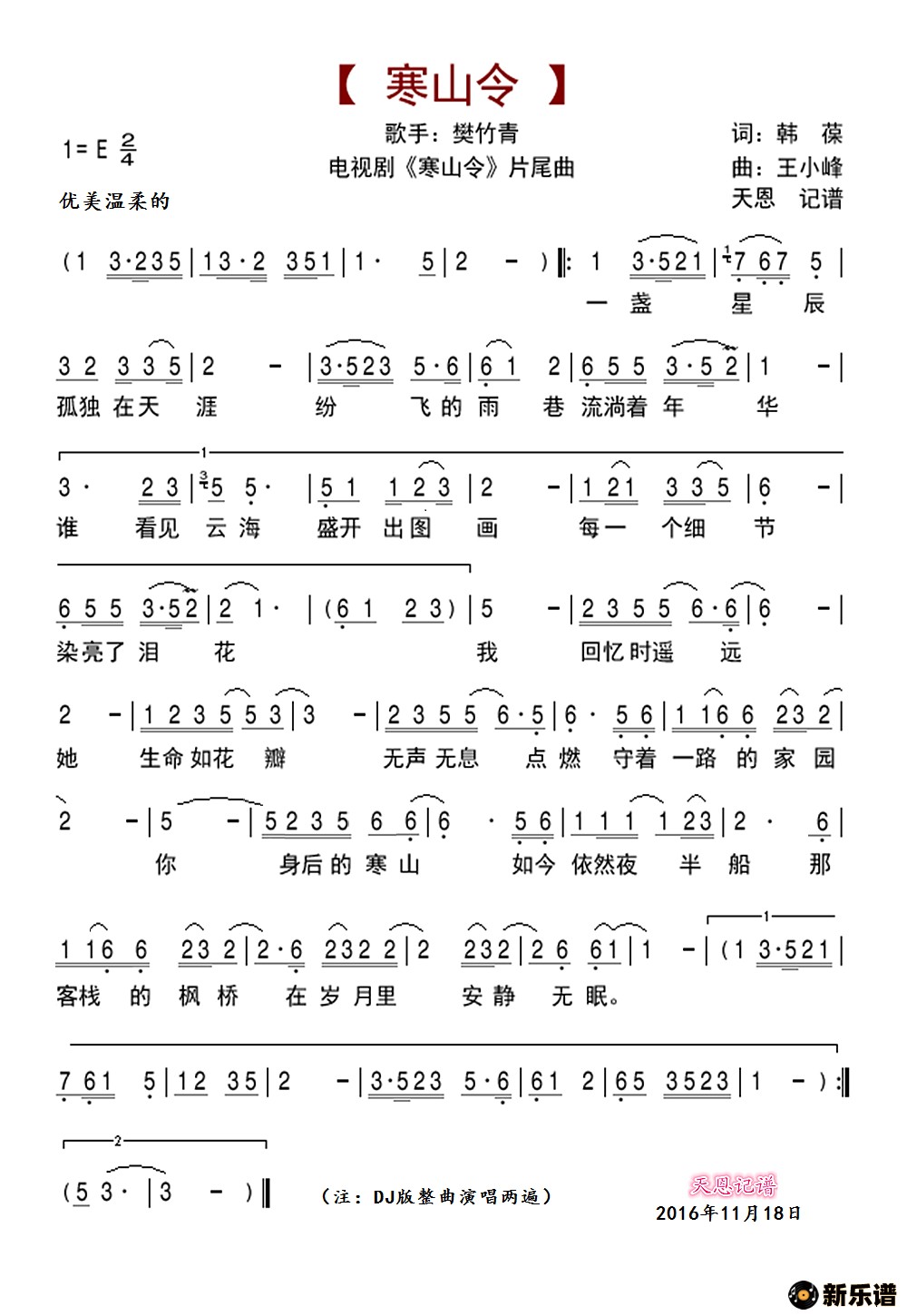 樊竹青演唱的《寒山令片尾曲》歌词,《寒山令片尾曲》简谱.