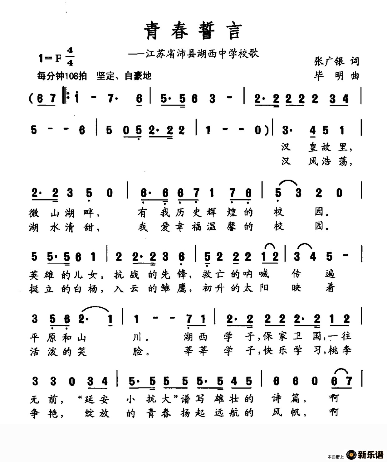演唱的青春誓言(江西省沛县湖西中学校歌)歌词,青春誓言(江西省沛县湖西中学校歌)简谱.