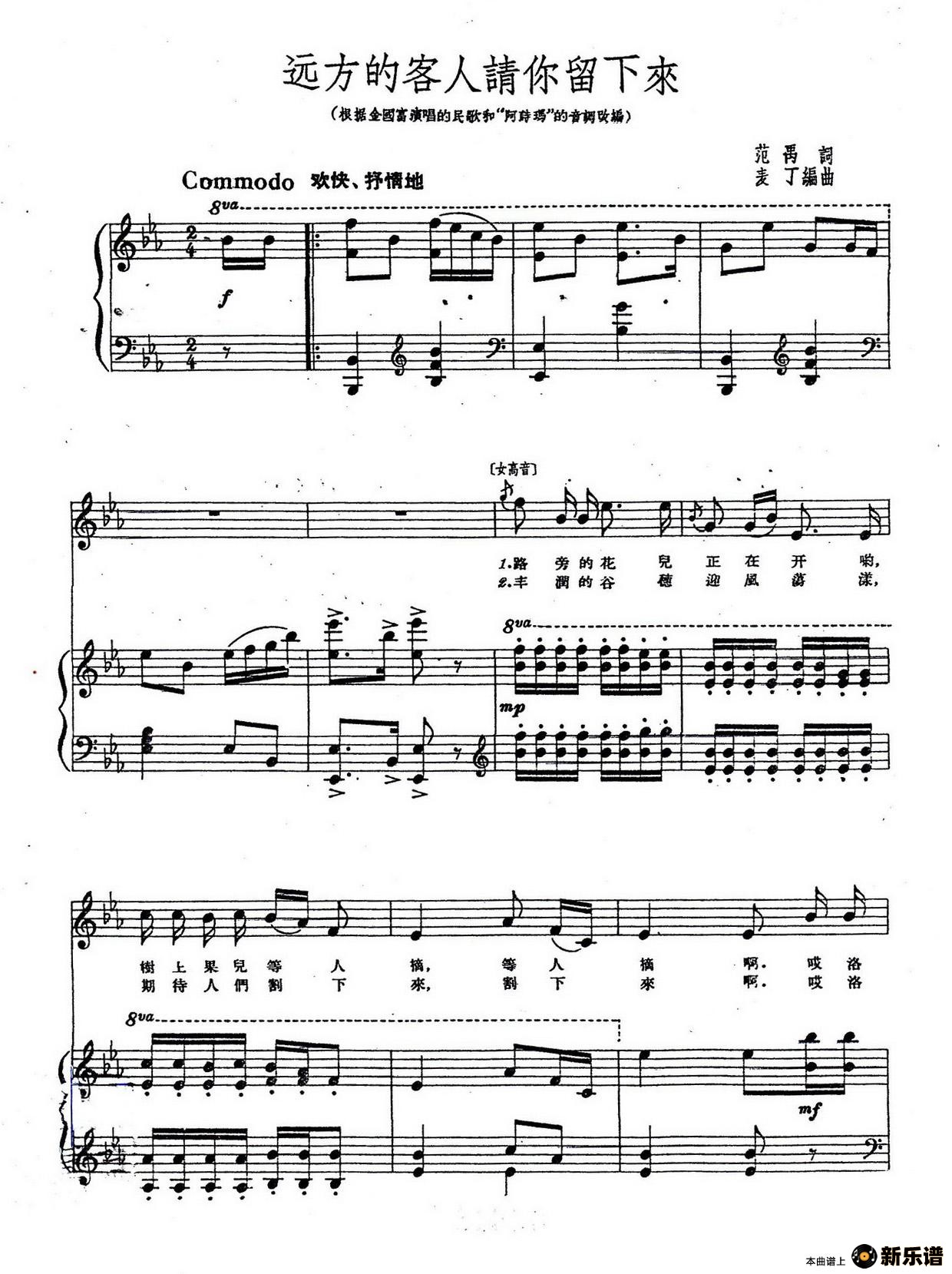 1.辽宁通信之声合唱团 2.中央民族歌舞团演唱的远方的客人请你留下来(正谱)歌词,远方的客人请你留下来(正谱)简谱.