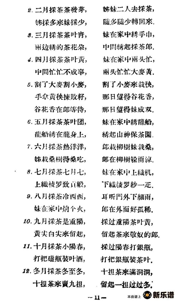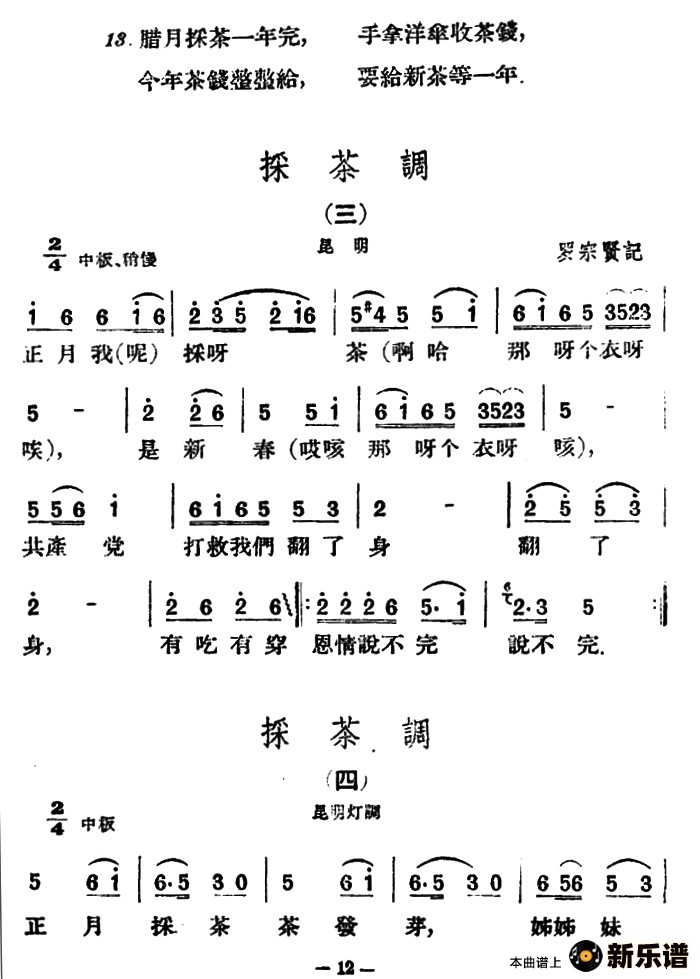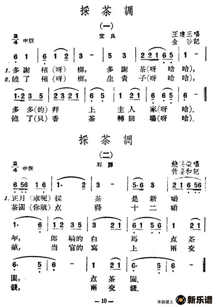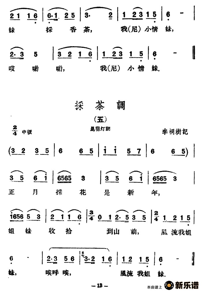 演唱的采茶调5首(云南民歌)歌词,采茶调5首(云南民歌)简谱.