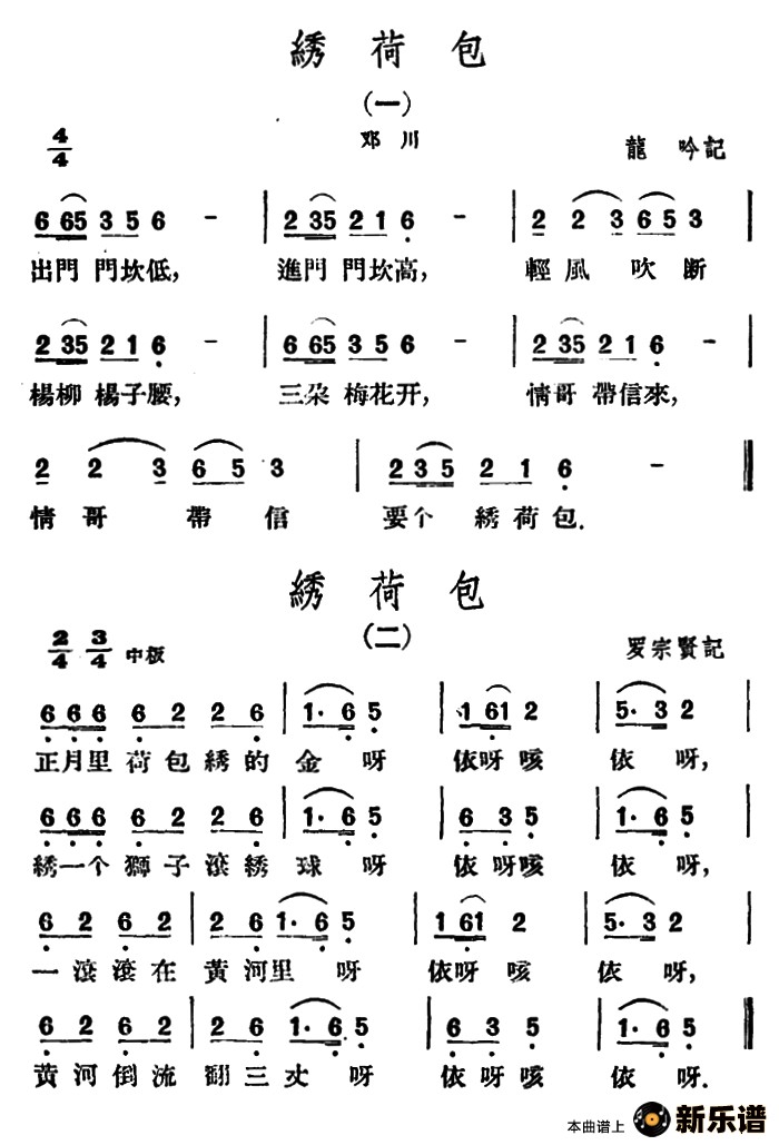 演唱的绣荷包2首(云南民歌)歌词,绣荷包2首(云南民歌)简谱.