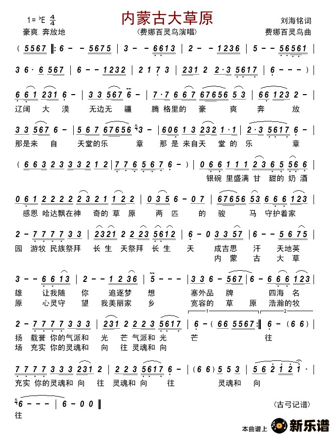 费娜百灵鸟演唱的内蒙古大草原歌词,内蒙古大草原简谱.