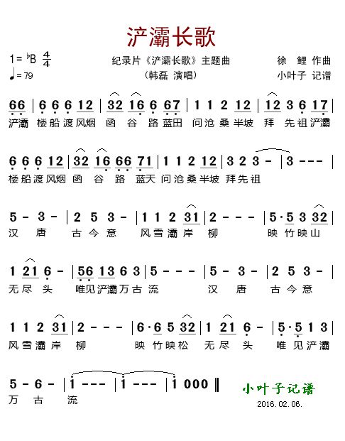 《浐灞长歌(纪录片《浐灞长歌》主题曲)》简谱 韩磊-小叶子制谱