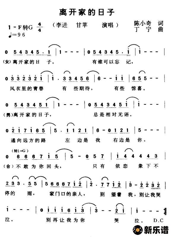 李进/甘苹演唱的离开家的日子歌词,离开家的日子简谱.