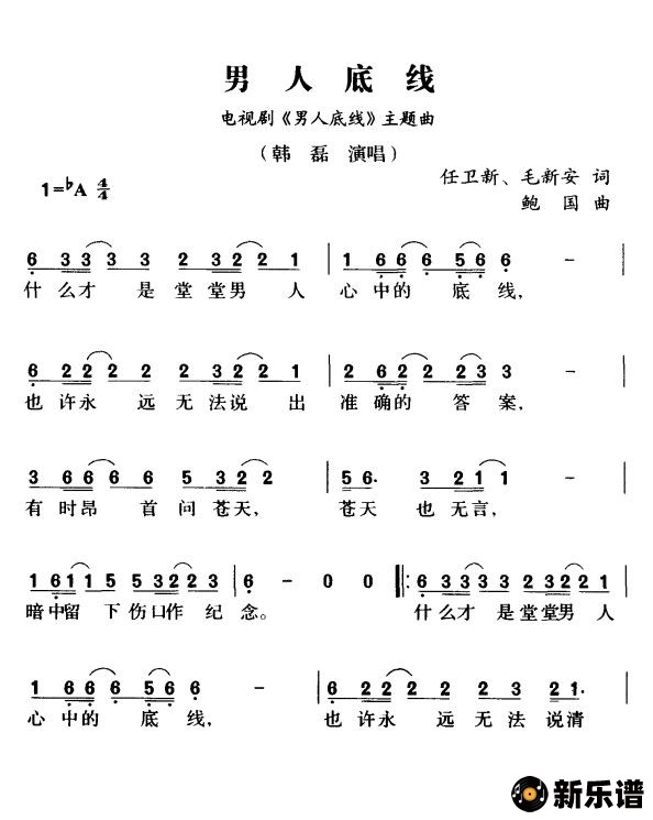 韩磊演唱的男人底线(电视剧《男人底线》主题曲)歌词,男人底线(电视剧《男人底线》主题曲)简谱.