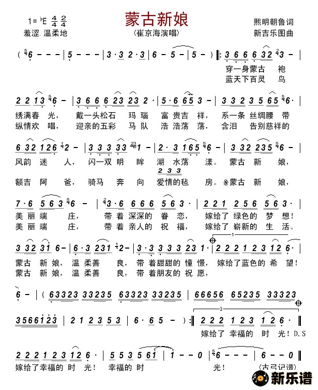 崔京海演唱的蒙古新娘歌词,蒙古新娘简谱.