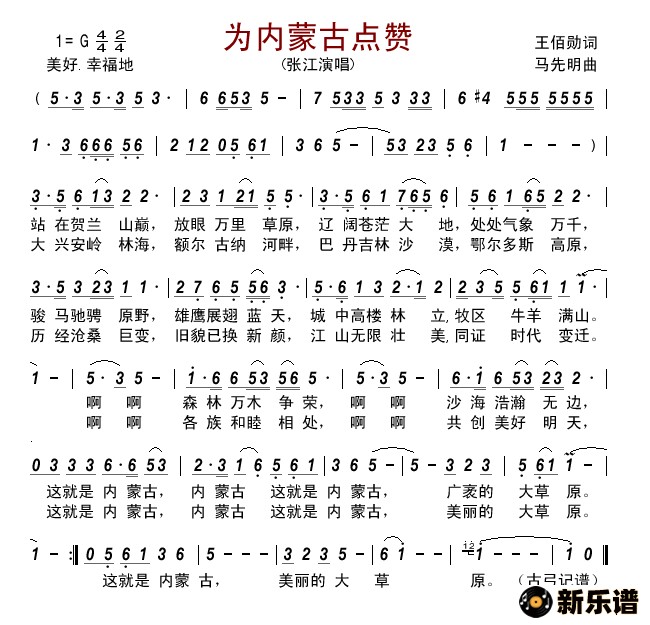 张江演唱的为内蒙古点赞歌词,为内蒙古点赞简谱.