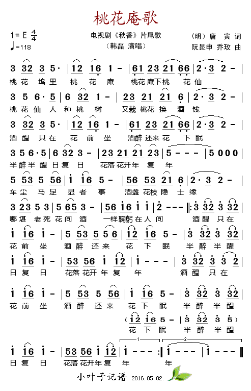 桃花庵歌(电视剧《秋香》片尾歌)最新曲谱
