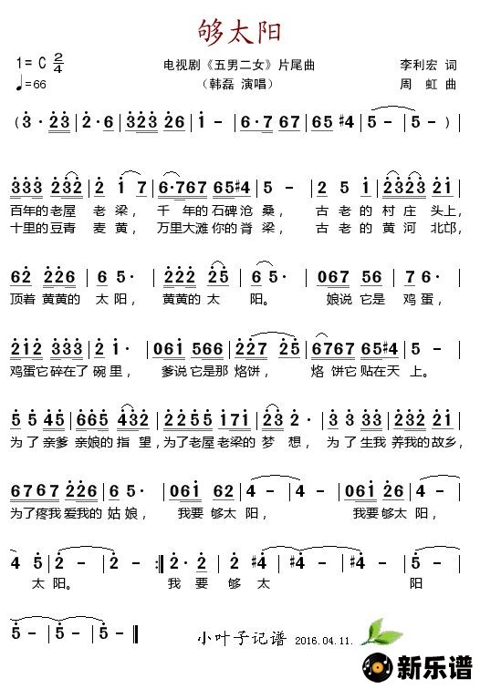 《够太阳(电视剧《五男二女》片尾曲)》简谱 韩磊-小叶子制谱