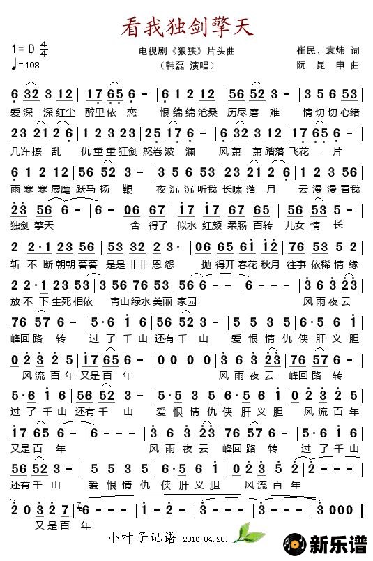《看我独剑擎天(电视剧《狼狭》片头曲)》简谱 韩磊-小叶子制谱