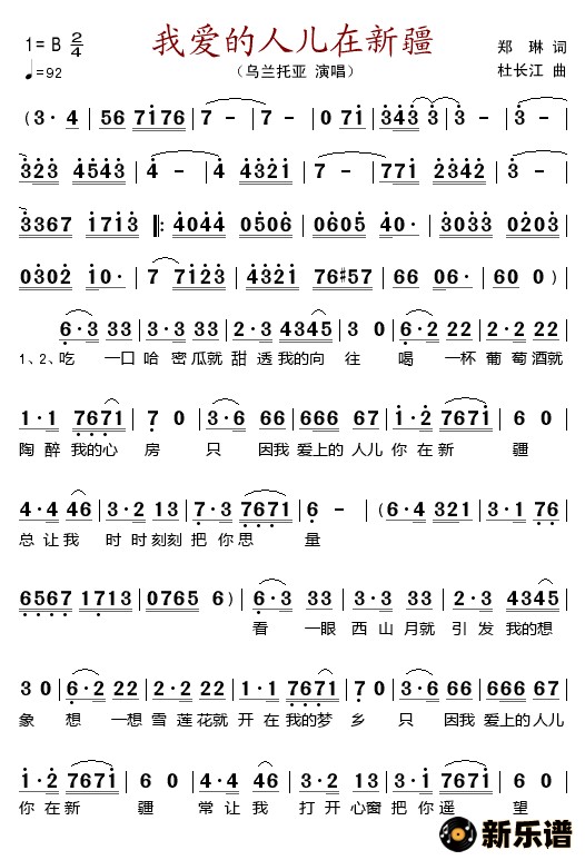 乌兰托亚演唱的我爱的人儿在新疆歌词,我爱的人儿在新疆简谱.