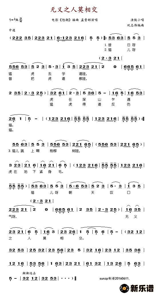 孟贵彬演唱的无义之人莫相交(电影《怒潮》插曲)歌词,无义之人莫相交(电影《怒潮》插曲)简谱.