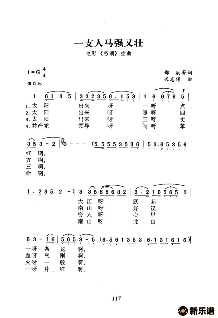 孟贵彬演唱的一支人马强又壮(电影《怒潮》插曲)歌词,一支人马强又壮(电影《怒潮》插曲)简谱.