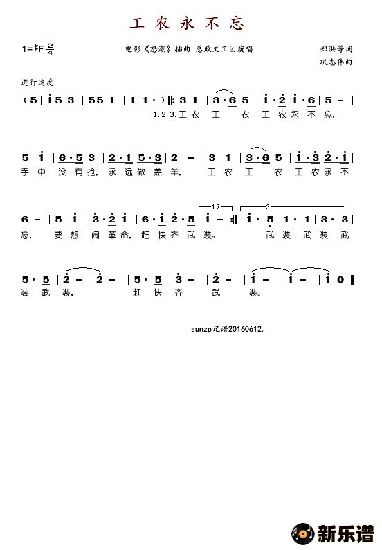 总政文工团演唱的工农永不忘(电影《怒潮》插曲)歌词,工农永不忘(电影《怒潮》插曲)简谱.