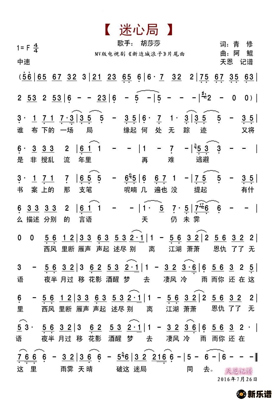 胡莎莎演唱的迷心局(MV版《新边城浪子》片尾曲)歌词,迷心局(MV版《新边城浪子》片尾曲)简谱.