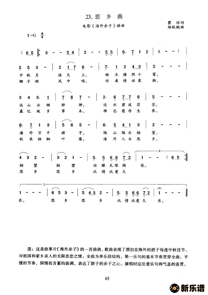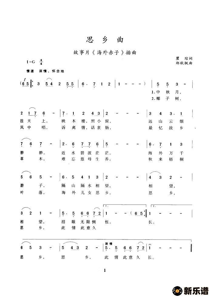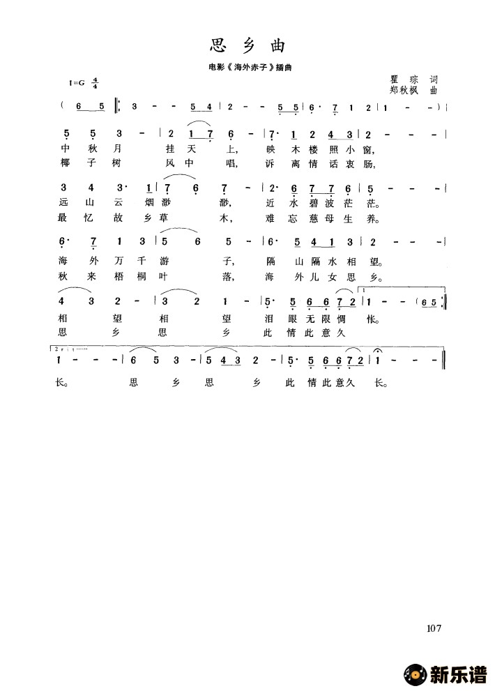 思乡曲(电影《海外赤子》插曲)最新曲谱