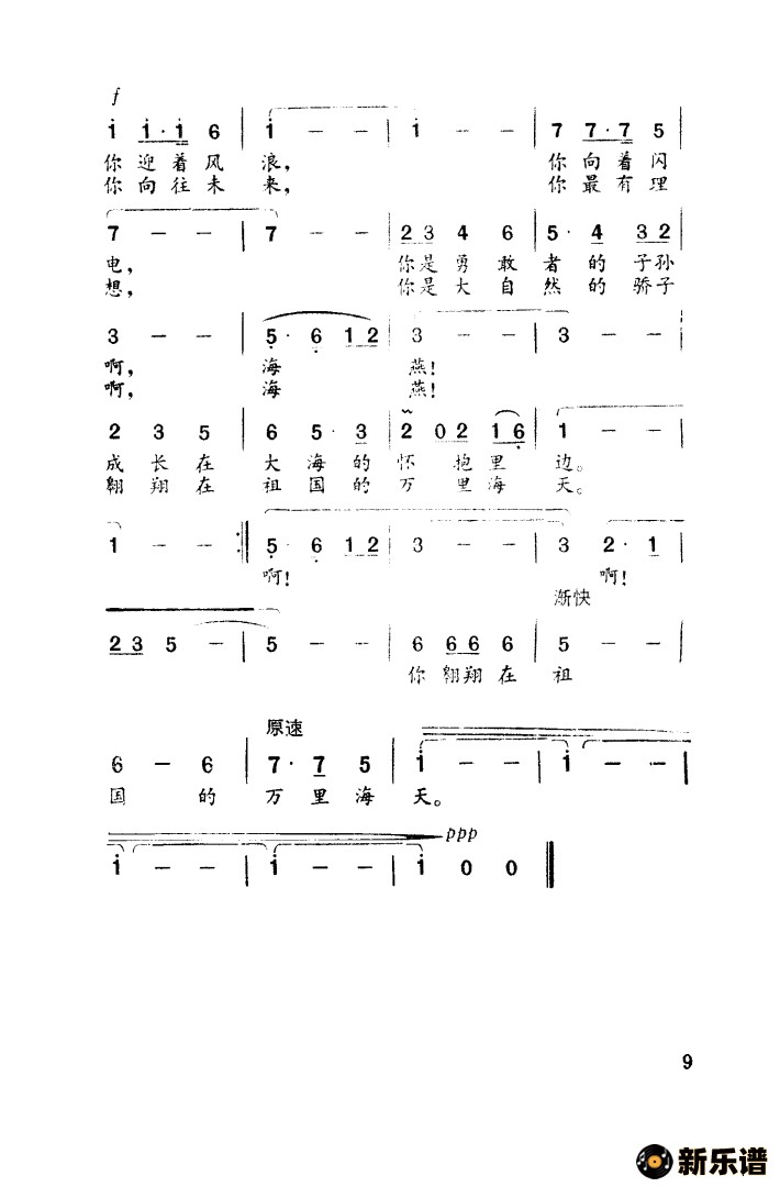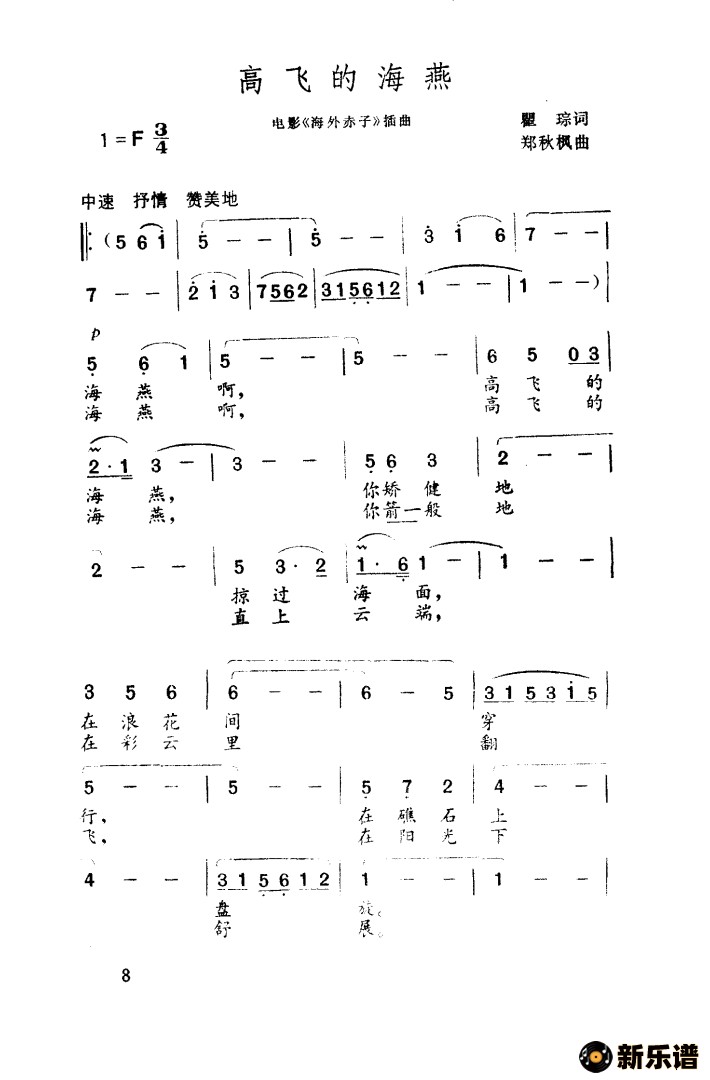 叶佩英演唱的高飞的海燕(电影《海外赤子》插曲)歌词,高飞的海燕(电影《海外赤子》插曲)简谱.